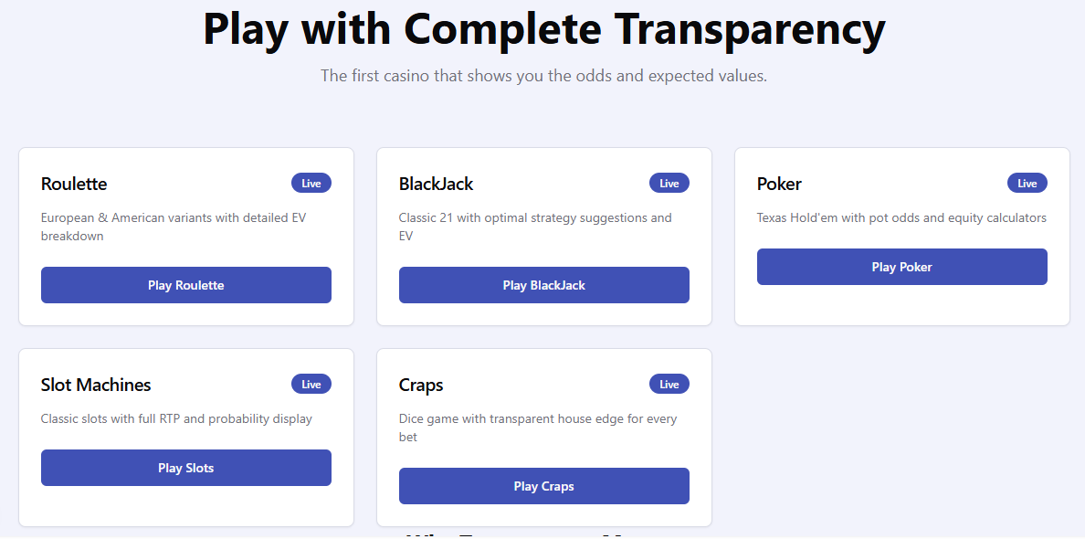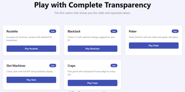 Step Inside the Transparent Casino - Practice playing the Slots, Roulette, Black Jack, Poker, Craps with pot odds and expected values shown along with AI assisted strategies.